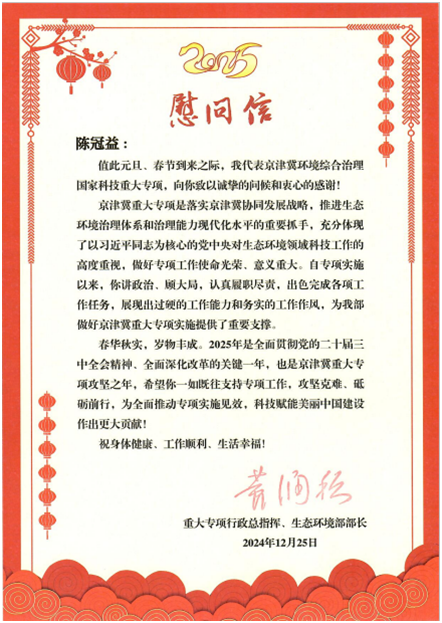 近日,京津冀环境综合治理国家科技重大专项(以下简称“京津冀重大专项”)行政总指挥、生态环境部部长黄润秋,技术总师贺克斌院士和王金南院士,及生态环境部科技与财务司等向我校发来署名慰问信和感谢信,感谢我校陈冠益教授在京津冀重大专项中作出的重要贡献。
