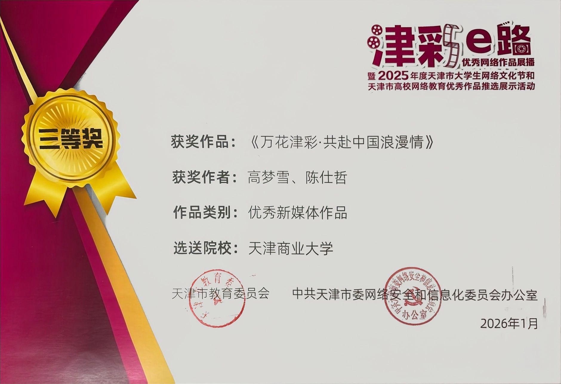 近日,市教委、市委网信办公布了“津彩e路”优秀网络作品展播暨2025年度天津市大学生网络文化节和天津市高校网络教育优秀作品推选展示活动评选结果,我校机械工程学院辅导员高梦雪、法学院辅导员王昱祺共同创作的《防诈心理学相声课》获优秀微课一等奖,高梦雪与国际交流处陈仕哲老师共同创作的《万花津彩·共赴中国浪漫情》获优秀新媒体作品三等奖。